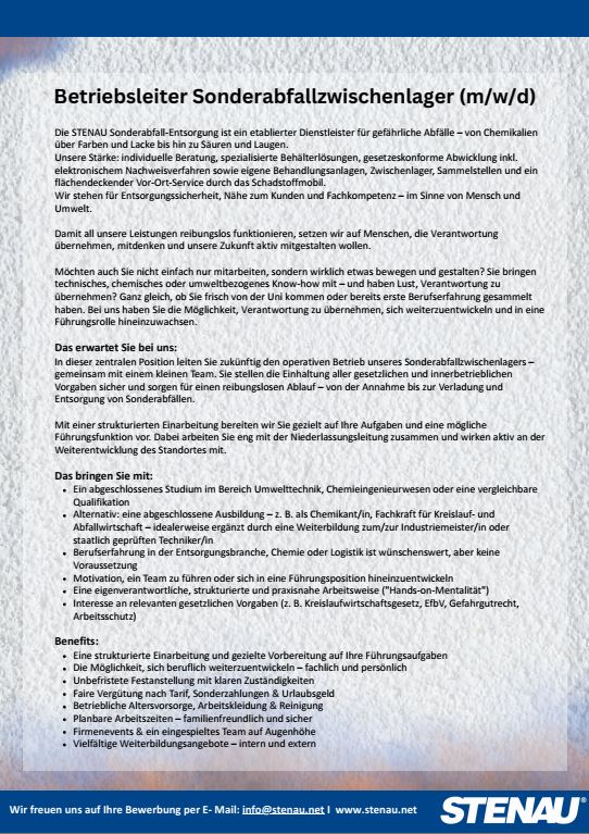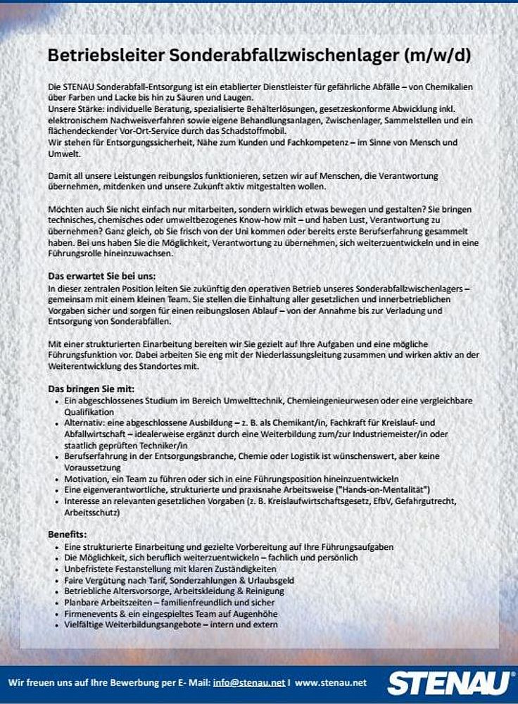 Gemeinsam die Zukunft gestalten braucht Freiräume. Ein Grund, warum man in der STENAU Gruppe vom ersten Tag an Vertrauen entgegengebracht und Verantwortung übertragen bekommt.Egal ob Fachkraft, Hochschulabsolvent/-in, Student/-in oder Schulabgänger/in wie auch als Mitarbeiter. Wir alle profitieren von den flachen Hierarchien und der zentralen Unternehmensstruktur, der hohen Flexibilität und der konsequenten Ausrichtung auf die Wertstoffmärkte. Gut entsorgen heisst möglichst viel dem Kreislauf zurück geben. Das braucht Kopf, Hand und Herz. Willkommen bei STENAU als nachhaltig handelnder Arbeitgeber.